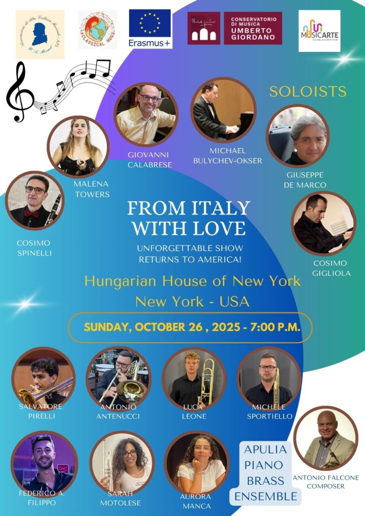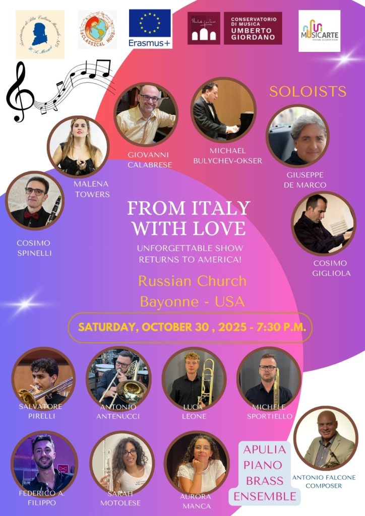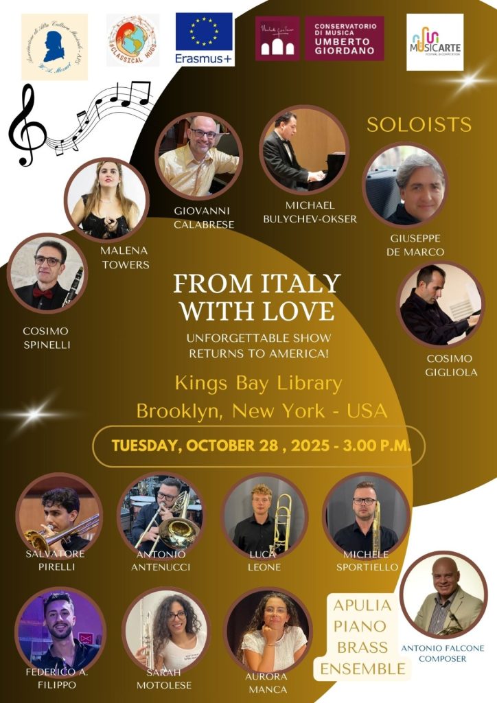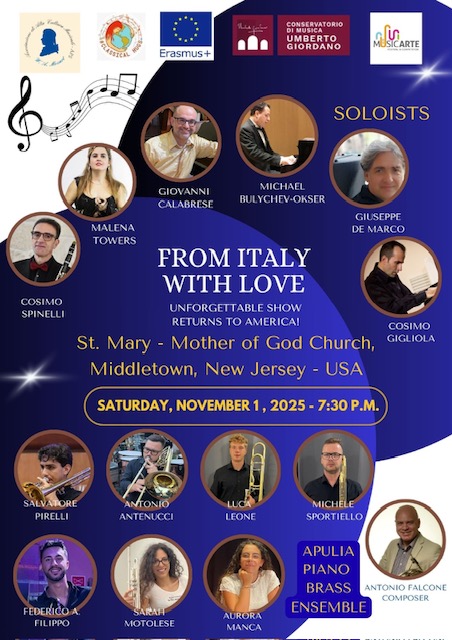 Il prof. Giuseppe De Marco, i trombonisti Antonio Antenucci, Filippo Antonio Federico, Luca Leone, Sarah Motolese, Salvatore Pirelli, Michele Sportiello e la pianista Aurora Manca, sbarcano negli Stati Uniti con il progetto “From Italy with Love” nell’ambito del Programma Erasmus: quattro concerti con i grandi classici intramontabili, dalle grandi arie d’opera fino alla musica napoletana, arrangiati per brass ensemble dal prof. Antonio Falcone.