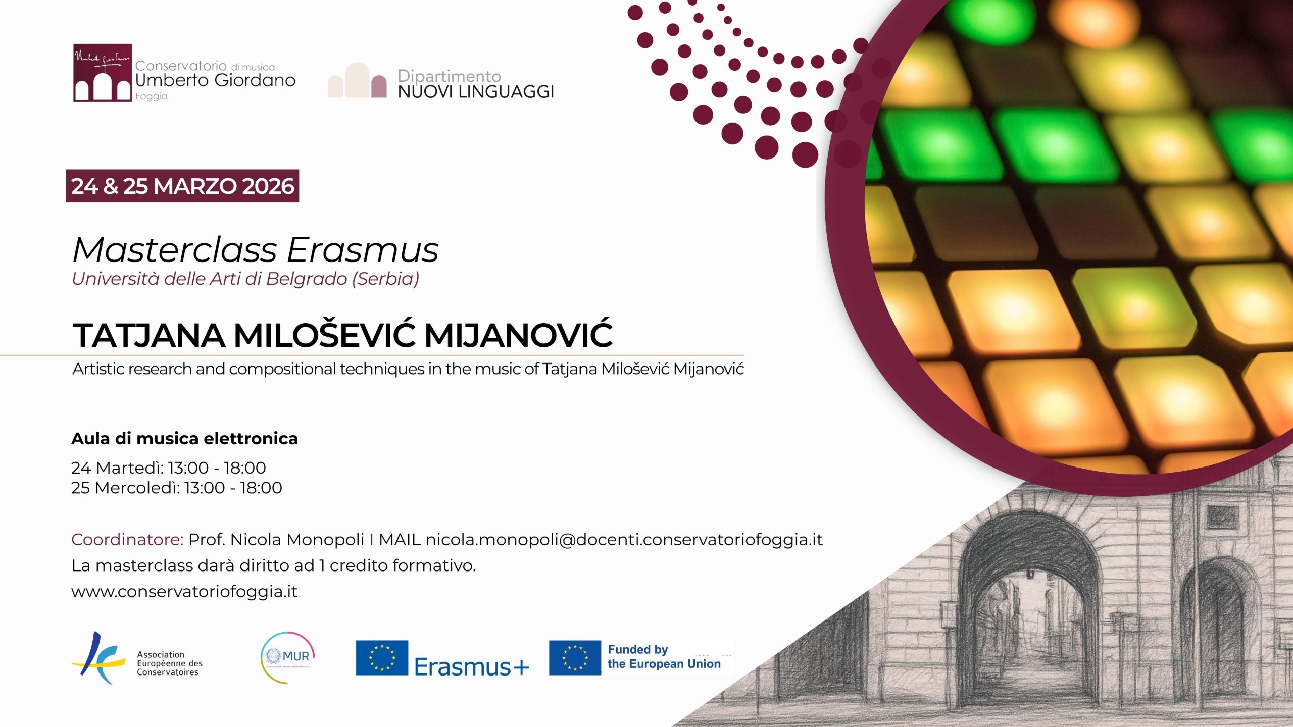 Il Conservatorio di Musica “Umberto Giordano” di Foggia, nell’ambito delle attività di internazionalizzazione promosse dal programma Erasmus+, organizza una masterclass tenuta dalla compositrice Tatjana Milošević Mijanović, docente presso l’Università delle Arti di Belgrado (Serbia).
